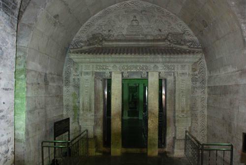 现在裕陵地宫的前三道石门,每道都用4根巨大的四棱形石柱支顶,共有石柱12根。人们一看便知,这些石柱并非原来就存在,而是后来增加的。如果原来就有石柱,巨大的棺椁是根本无法进入地宫的。