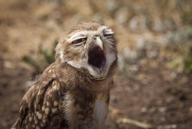 鸟类和体温调控:鸟类观测者表示,鸟类像人类一样,当早上醒来时,经常打哈欠和伸展身体。科学家对虎皮鹦鹉进行实验观察,认为鸟类打哈欠行为可能有助于调控身体温度。图中是打哈欠的猫头鹰。