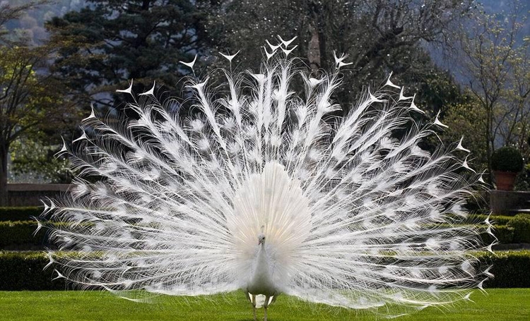 白孔雀:白孔雀缺少万花筒似的颜色,这种现象是由于基因突变造成的,可能是由于身体缺少黑色素所致。