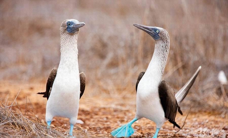 蓝足塘鹅:图中右侧是一只雄性蓝足塘鹅正在向左侧的雌性展示自己独特足部。