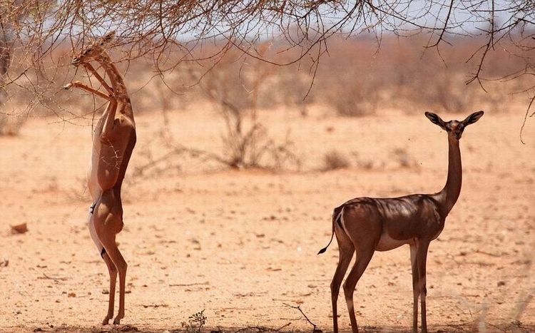 长颈羚:长颈羚长着较长脖颈,以及与身体不对称的大耳朵,后肢能够直立,用前腿向前伸展进食较高位置的树叶。