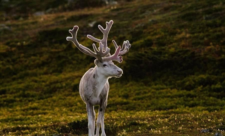 白驯鹿:这并不是白化个体,这只白驯鹿的鹿角带有浅桃色,它们生活在瑞典拉普兰地区,是一种基因变异的实例。