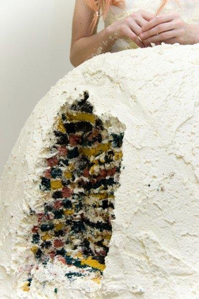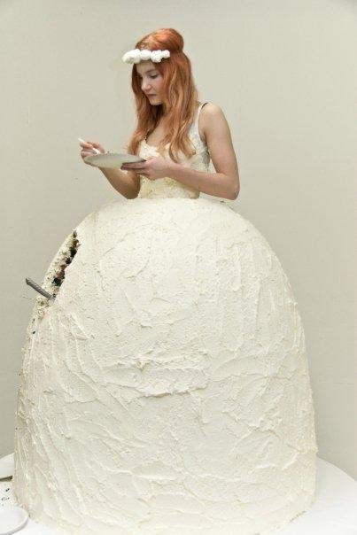 先前也曾有艺术家利用蛋糕制作婚纱,但相比那条随便用奶油糊的裙子,显然这条几乎可以以假乱真的裙子更加精美。