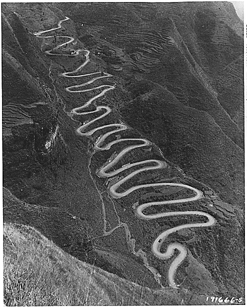 比起利用大型直线斜坡,螺旋斜坡会大幅增加建材的搬运距离。图为中国贵州境内的“二十四道拐”。