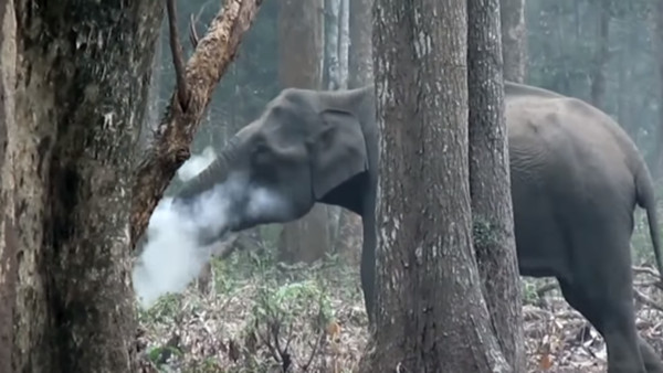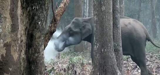 最近这个大象火了!看照片烟雾缭绕的,难道它在吸烟吗?动物也会有烟瘾吗?这一幕发生生在印度的Nagahrole国家公园里,有人看到这神奇一幕,就录了下来,从影片中能看到,一头大象将地上的木炭卷到口中,从嘴巴里冒出了很多白气,看着真的好像在“吸烟”。
