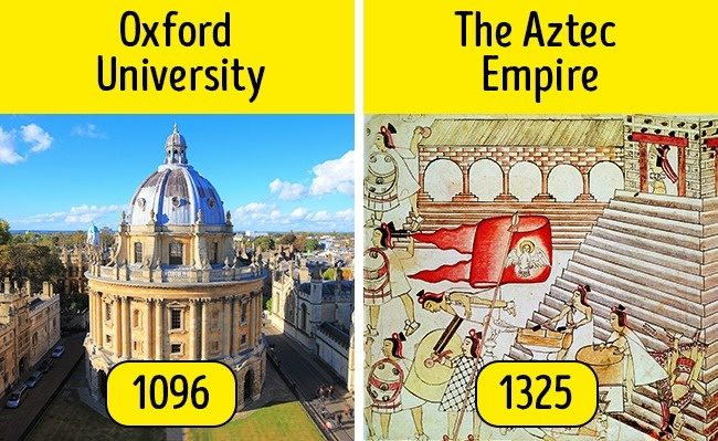 阿兹特克帝国大约是在公元1325年建立的,牛津大学虽然没有确切的建校时间,但从公元1096年就已经有人在当地教书了,在牛津大学的一间实验室里,还有一个从1840年就敲到现在的钟。
