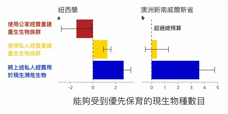 在三种情境下 (使用公家经费 [红色长条]、使用私人赞助经费 [黄色长条]、将私人赞助经费用在现生物种 [蓝色长条]) ,在新西兰 (a) 和澳洲新南威尔斯省(b)境内,与现况(虚线)相较,能够被优先保育的现生物种数目。新南威尔斯省在“公家经费”项目无法估计,因为让两个有望执行重生计划的物种复生,就已超过该省用在保育濒危物种上的总预算。图片来源:Figure 1 in Bennett et al. 2017. Nat. Eco. Evol. 1, 0053. Reuse permission granted (Licencse Number: 4081050950784)复育现生濒危物种已经是难上加难的烧钱工作,更何况是复育已经灭绝、不知道能不能和平融入现代生态系里的物种。所以重生生物学是否可以消除物种灭绝危机,帮助维持或增加生物多样性吗? 答案恐怕是无法,而且在经费有限的情况下,甚至可能间接造成现生物种加速灭绝。
