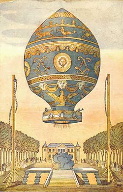 1783 年 11 月 21 日,物理学家路泽Jean Francios Pilatre de Rozier以及达兰德斯Marquis d’Arlandes成了史上最先飞行的人。他们在成千巴黎人,包括皇室成员和富兰克林的见证下,乘坐由蒙哥尔费兄弟(brothers Joseph and Etienne Montgolfier)设计的热气球飞行,很快地激起一股热气球风潮。