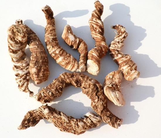 七叶一枝花其药用部分就是他的根茎。结节状扁圆柱形,略弯曲,长5-12cm,直径1.0-4.5cm。表面黄棕或灰棕色,外皮脱落处白色。密生层状凸起的粗环纹,一面结节明显,其上有椭圆形凹陷茎痕,另一面有疏生的须根或疣状须根痕。顶端具鳞叶及茎的残基。质坚实,断面平坦,白色至浅棕色,粉性或胶质。