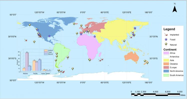 图二、世界目前已知的鲸落位置,Implant=人工鲸落 Fossil=鲸落化石 Natural=自然鲸落(Li et al. 2022)