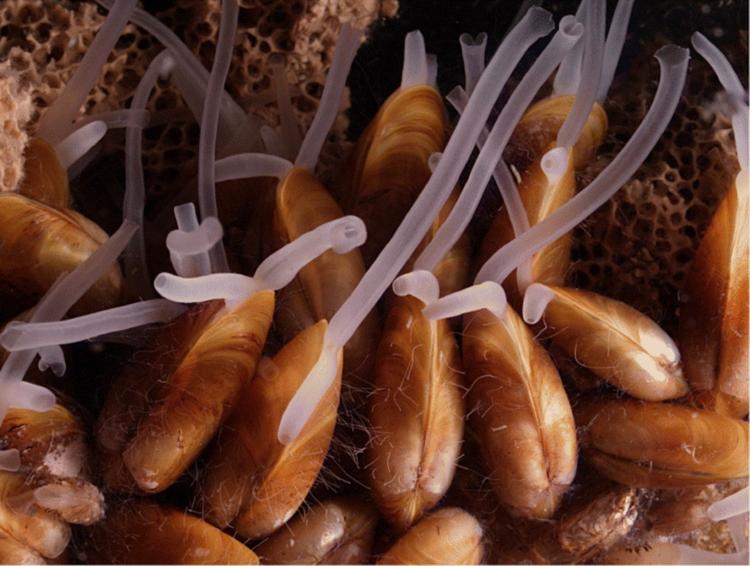 图五、位在抹香鲸嵴椎骨的贻贝(Fujiwara et al. 2007)