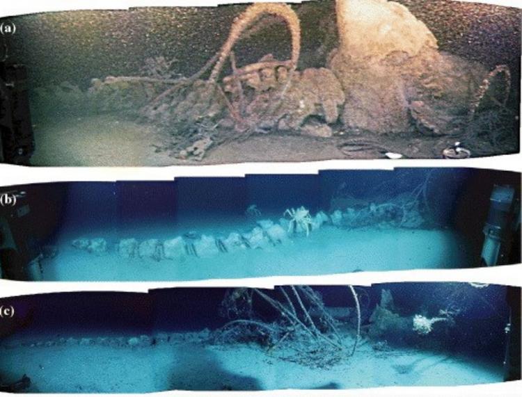 图四、编号 12 之抹香鲸 a. 2003 年 7 月 b. 2004 年 7 月 c. 2005 年 7 月利用水下探测载具拍摄影像(Fujiwara et al. 2007)