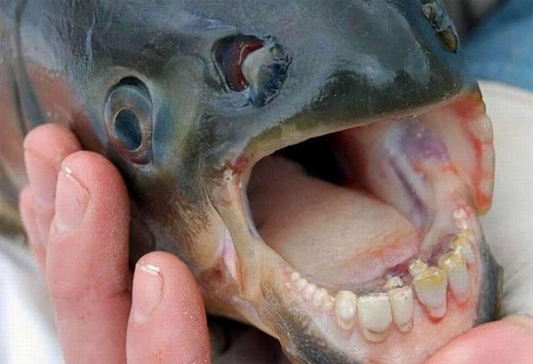锯腹脂鲤:仔细一看这种鱼长着类似人类的牙齿,这并不是恶作剧,当人们看到这种牙齿时会有毛骨悚然的感觉。虽然它们是食人鱼近亲物种,但更倾向于用牙齿咬碎落入水中的坚果。