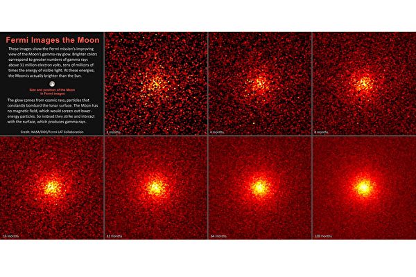 费米伽马射线太空望远镜观测到的过去十年闲月球发出的伽马射线图像,随时间越来越清晰。