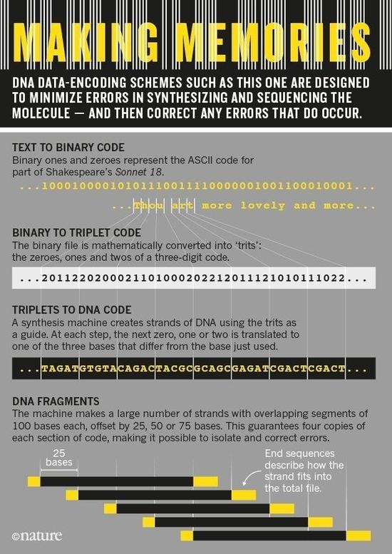 一方面涉及到不像二进制编码数据1和0,而是三个碱基——相当于0,1和2。然后,他们不断旋转,其中的DNA碱基代表每一个数字,以避免在读取过程中可能导致问题的序列。通过重叠。100-碱基-长度字符串由25个碱基逐步转移,EBI科学家也保证会有四个版本——每个有25-碱基的部分,用于错误检查和彼此对照。
