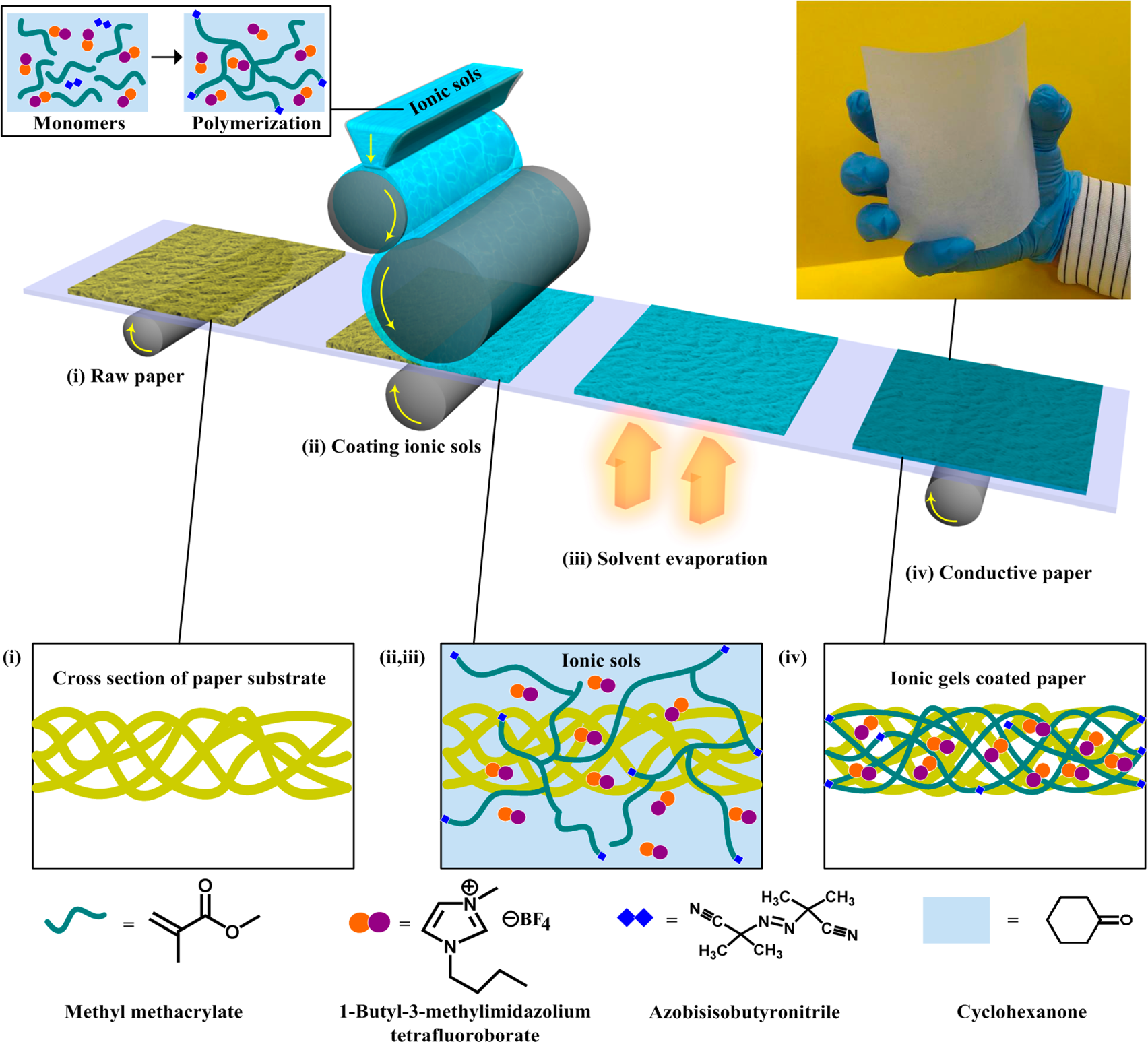 他们利用滚轮将离子凝胶(ionic gel)附着在纸上,这些离子凝胶具导电性并且会渗入纸的纤维,经过适当热处理让溶剂挥发后(示意图如下),导电物质便能留在纸的纤维中。离子凝胶其实也是由高分子组成,含有导电的有机物(所以虽然说纸本身环保,但添加物还免不了有不环保的物质)。相较于其他在实验室小规模生产的技术,利用像印刷术的滚轮进行制备能够大量且快速生产,且离子凝胶的杨氏系数与纸接近,当纸被弯曲或卷起时,这些导电物质还能够附着在纸上,维持其导电度。