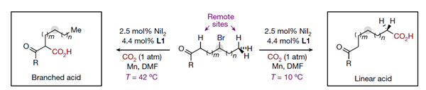 上述是透过移动官能基到末端的方法制造脂肪酸。由于原料的碳链两端是一样的,脂肪酸接在哪一侧并不重要。但如果原料的碳链本身就具有不同的官能基在两端,利用上述的方法仍会制造出两种不同的脂肪酸。因应此问题,科学家发明一种方法可以决定羧基要接在碳链的哪一端。如图四所示,如果将温度控制在42–50 °C,碳镍键结倾向于待在左边。反之,如果将温度维持在约10 -25°C,碳镍键结喜欢待在右边。如此一来,我们透过选择温度,可以选择要产生哪一种脂肪酸。