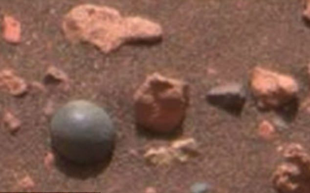 影片中能看到,把颜色增强之后,火星上的这棵灰色的岩石就像一一颗球,有位站长(幽浮观测网站)Scott C. Waring评论说:“这大小和炮弹一样。”他说这是火星上曾经发生过战争的证明,这“球”周围的碎片应该是一个文明聚集地。