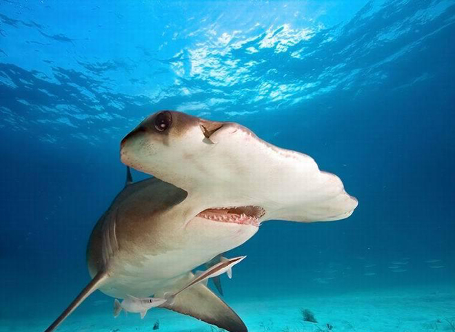 双髻鲨有360度视角:双髻鲨特殊的身体结构使其拥有独特的双眼视觉能力,2009年一项研究表明,由于它们的眼睛位于细长头部前端,因此具有非常好的双眼视觉,相比之下,多数鲨鱼的眼睛位于头部两侧,不是前端,这意味着它们不具有较好的立体视觉。同时,双髻鲨也有视觉盲区,位于它的头部顶部和下方。
