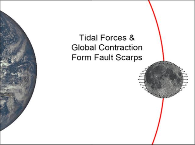 他们指出,月球重力牵引力的变化受地球影响,伴随着椭圆形轨道运行,地球引力将对月球表面产生不同寻常的作用。沃特斯博士指出,地球引力与月球内核冷却导致的全球收缩性叠加在一起,将使月球表面形成与众不同的裂缝结构。