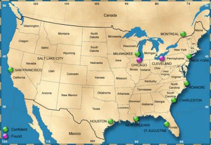 眼尖的朋友们有发现绿色的标示只有 9 个吗?少了一个,我刚查了一下,还有一个在波士顿(Boston),上面这地图应该是漏画了。