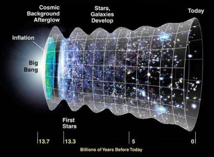 这张是NASA的示意图解释宇宙的进化,从大爆炸开始(左边)到今天(右边)。宇宙用一个钟的形状来显示它的扩张。大爆炸之后宇宙在很短的时间内快速的扩张,然后它的扩张开始变慢。