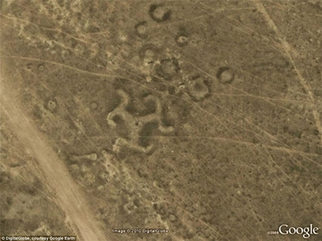 目前,从太空角度观测显示哈萨克斯坦图尔盖地区干草原上存在着“十字记号”图案,虽然该图案曾被德国纳粹使用,但事实上这是一个远古符号,已有12000年历史,用于描述繁荣和权力。最早的十字记号是在乌克兰Mezine地区旧石器时代遗址发现的,是由猛犸长牙制成的,其历史可追溯至公元前1万年。