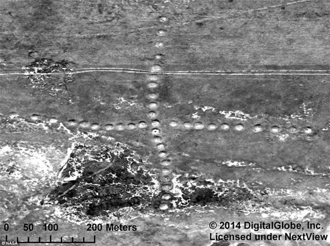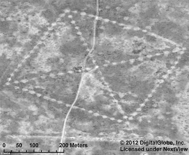 如图所示,这是哈萨克斯坦干草原上发现的十字记号图案,它首次发现于2007年,是哈萨克族经济学家德米特里耶-戴伊(Dmitriy Dey)通过谷歌地球发现的,该十字记号图案是由若干个土丘构成,高度0.9米,宽度9米。考古学家推测哈萨克斯坦境内发现的这些远古印痕已有8000年历史。