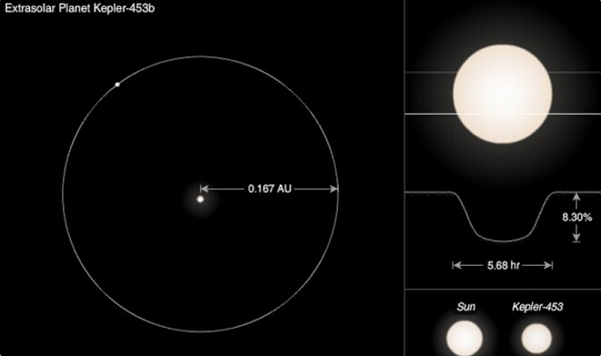 环绕两颗恒星的行星称作”环联星(circumbinary)”。人们曾经认为,在这样的环境下一个行星不可能,数十亿年维持一个稳定的环绕,但这已经是第十个克卜勒发现的行星。克卜勒453b不像之前大部分所发现的,它会接收足够的光线,并将之置于”适居带(Goldilocks zone)”,对地表上的液态水就不会太热或不会太冷。(它是一个岩石行星,而非气体巨行星)。