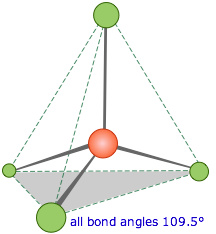 上图就是一个典型的四面体键。和你猜测的一样,一个正四面体分子构型中,每个键角角度都约为109.5度(正四面体分子构型),形状为金字塔型。但液态的水分子并非这样规规矩矩的四面体——水分子中未成键的孤对电子将两个氢原子相互推拢,这样其中一个夹角变成了104.5度,整个四面体变得不规则。