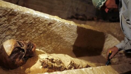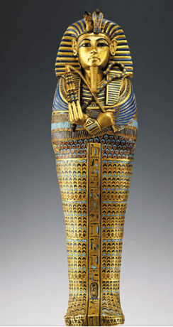 躺在棺内的图坦卡蒙带着一副很大的金面具,这副面具和他本人的相貌几乎一模一样。