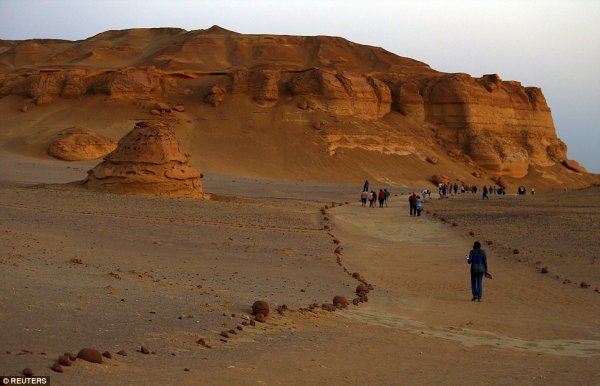游客们走在鲸鱼谷自然保护区的戈壁滩上,沿途可以看到很多鲸鱼化石。