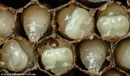 受国家地理委托,摄影师Anand Varma为蜂巢里的蜜蜂拍摄了一段60秒的短视频。视频不仅记录了蜜蜂在生命的前21天从幼虫变成蛹的过程,还记录了对幼蜂造成巨大伤害的寄生虫狄氏瓦螨。