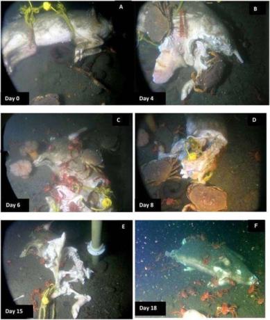 最先被丢进海里的两具尸体很快被分解得只剩下骨头(大约3周时间),但是第三只被丢进海里的猪只尸体在90天后大约只被吃掉了三分之一。研究人员发现,造成这种差异的原因是第三个尸体的丢弃位置氧气不足。