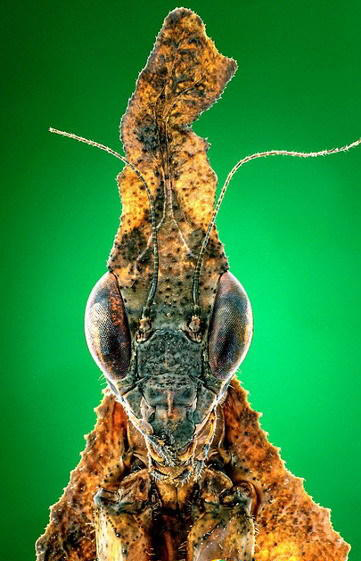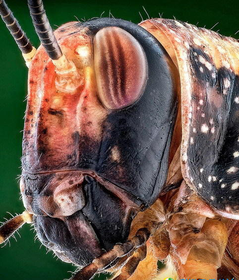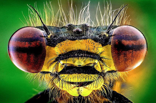 摄影师库图勃-乌丁(Kutub Uddin)使用一台标准相机,配备特写镜头和滤镜,拍摄到一些美妙的昆虫微距图像。能够真实呈现昆虫的眼睛、细小毛发,以及盾状身体结构。如图所示,这种彩色动物犹如来自于另一个世界,但事实上是一只蜻蛉的大特写镜头。