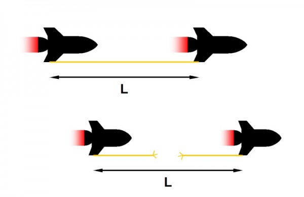 因为发射后的第五年,太空船所发出的光会比太空船本身还要慢,所以当太空船在回来地球的时候,地球上的人会同时看见一台已经离开的太空船跟一台正要回来的太空船。