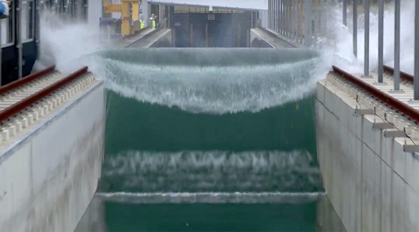 机器如何运作: 四个强大的活塞在7米高的金属板后面,以一秒1000公升的速度推挤9百万公升的水量在水道里面。挑战是要制造出大海的力量,像是暴风跟大浪。
