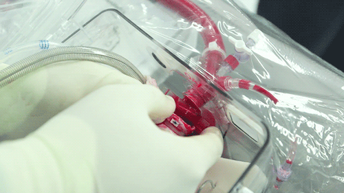 一颗捐赠心脏在体外连接着血液和氧气供应跳动着。