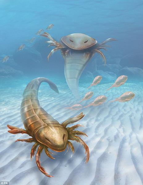 这是艺术家描绘的Pentecopterus decorahensis,其生活时期可追溯至4.6亿年前,它的肢体较特殊,长有划桨状结构。