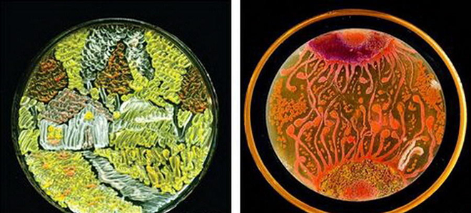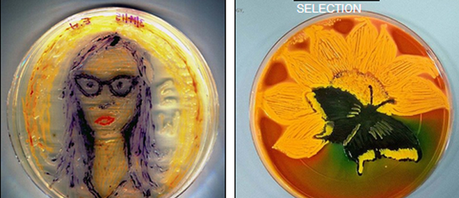 左图肖像是使用紫色杆菌设计的,紫色杆菌是由微小、染色微粒青紫色杆菌素生成的,形成许多对比颜色,可清晰地看到人物肖像的头发和眼镜,同时,黄色菌株作为肖像背景底色;右图是盛开的太阳花和黑色蝴蝶,黑色蝴蝶是由沙门氏菌生长形成,太阳花是由大肠杆菌生长形成。