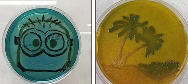 左图作品叫做“微小下属”,是动画片《卑鄙的我》中的小黄人角色图案,这是弧菌在琼脂中培养生长形成的;右图作品叫做“沙滩”,也是弧菌培养形成的,弧菌种属存在于甲壳纲动物,如果人体摄入将损害身体。