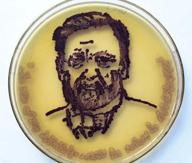 图中是法国著名微生物学家路易-巴斯德的肖像,艺术家在琼脂上培养青紫色素杆菌,通常青紫色素杆菌会导致动物和人体感染,它们是一种“条件致病菌”。青紫色素杆菌有能力生长在任何媒介,并制造一种叫做“青紫色素杆菌素”的抗氧化剂。