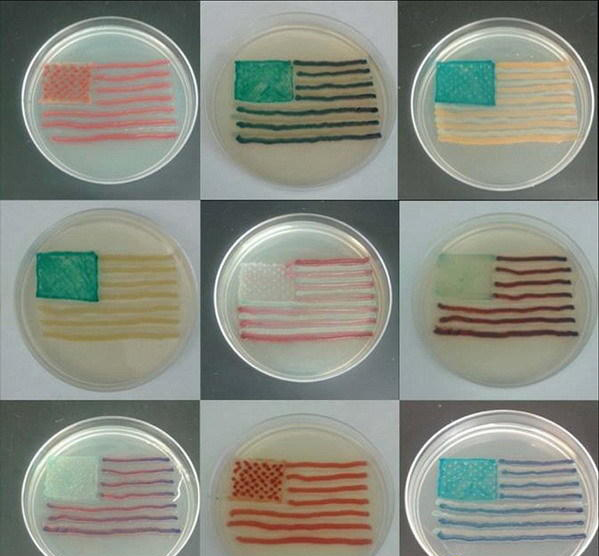 如图所示,这是研究人员使用粘质沙雷氏菌和不同大肠杆菌在半乳糖苷溶液中培育形成红色、白色和蓝色国旗。