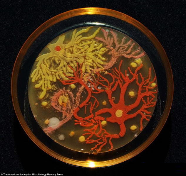 图中作品叫做“肠道细菌花园”,是使用多种肠道细菌“混合绘制”,其中包括:大肠杆菌(淡紫色)、柠檬酸杆菌(蓝绿色)、佛里德兰德氏杆菌(深蓝色),这些肠道细菌养殖在发色体琼脂中,琼脂会随着不同细菌而改变颜色。