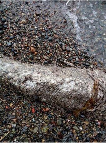 遗体在Sakhalin岛的海岸边搁浅,一部分组织已经开始腐烂,还有些身体都已经四分五裂的散了,还暴露出体内的骨骼。很多人从轮廓上推测这大概是一只海豚,不过这个推测并不准。
