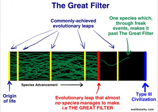 大过滤器理论(Great Filter theory)认为,从前期生命发展到类型III的智慧,在某些时间点上会有一堵墙,而几乎所有生命都会撞上去。在漫长的进化过程,有某些阶段是生命极不可能或不可能超越的。这阶段就是大过滤器。