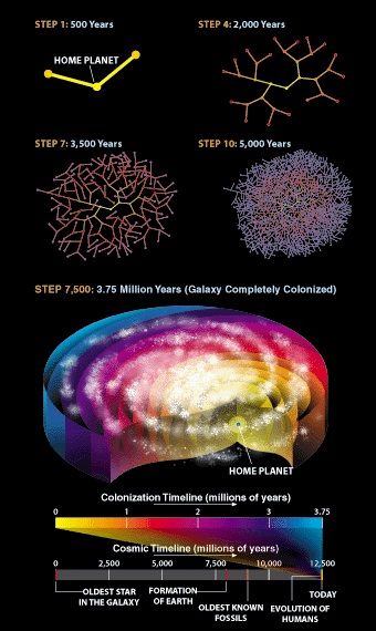 有一种假设认为,假如建造可以前往其他行星的机器,则星系间的殖民就可以实现,花500年左右时间在他们新的行星上以原料来自我复制,然后再送两个复制品出去做相同的事情。即使没有用接近光速的速度来旅行,这过程可以在375万内殖民到整个星系。与几十亿年的尺度相比,这只不过是一眨眼的时间: