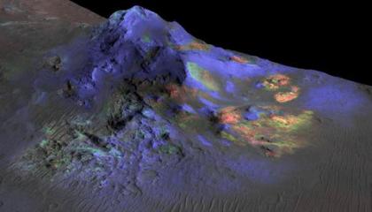 至今为止科学家已经在火星的数个陨石坑中发现了冲击后留下的玻璃(绿色),同样探测到的还有矿物辉石(蓝色)和橄榄石(红色)。NASA的火星勘测轨道飞行器传来的彩色编码构成信息被转化成了地形模型,不过垂直维度被放大了一倍。