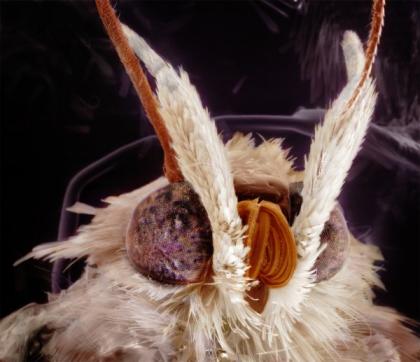 他通过立体显微镜捕捉昆虫的颜色,用微型LED照射样本,然后使用两三个小反射镜和柔光镜微调成像。显微镜是浅景深,所以他可以利用不同的焦距结合六幅图完成最后的图像。
