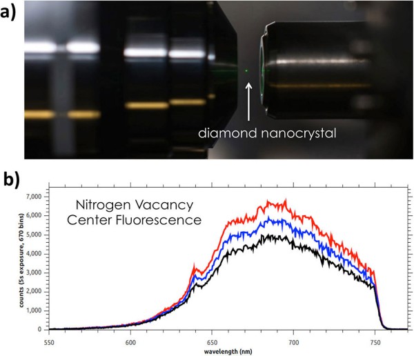 这项发表在自然光子学(Nature Photonics)的研究将使得显微观测器进入新的纪元。这项实验分为两个阶段,第一阶段使用的雷色光来对抗地心引力,将纳米钻石拉起来漂浮在空中,而第二阶段则让研究人员能够看到钻石发射出来的光的波长,找出其能量结构。这个实验需要两种雷射光:一个用来局限和让钻石漂浮,另一个则是引导它发光(光致萤光光谱< photoluminescence >)。